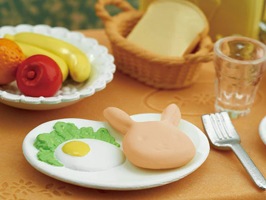 Includes two place settings for a full breakfast with glass, plate and fork, plus waffle maker, toaster, basket of bread & fruit bowl.